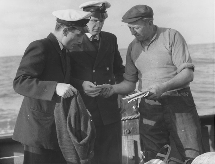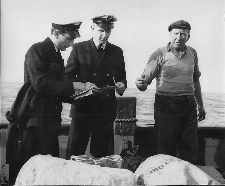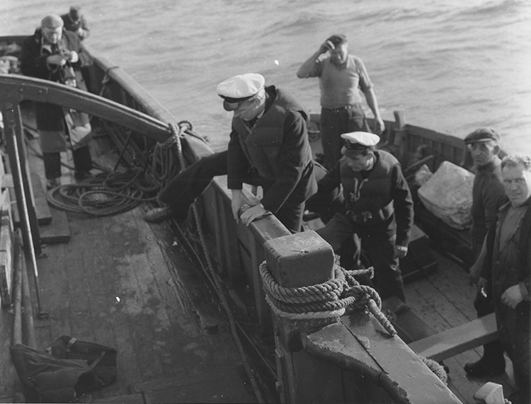 Geoffrey Churchill contacted us to say that he believes the keeper in the centre of the photo was his uncle, Ron Churchill. Born in 1929 at Studland, Dorset, Ron served at the Eddystone and Hartland Point during the 1950s and 60s. This photo shows him on a relief boat for the Eddystone, with the kit bag lower right bearing the lighthouse name. Photo copyright Daily Mirror (George Greenwell) undated.