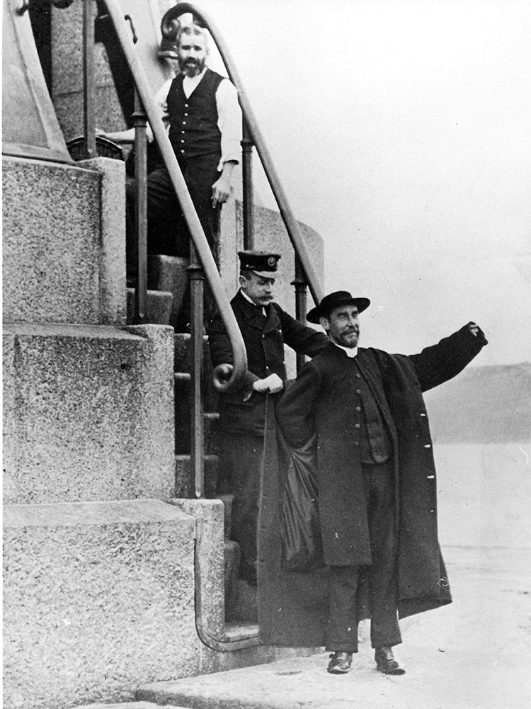 Keepers on the Plymouth Breakwater lighthouse, saying farewell to a local clergyman. Photo unmarked and undated.